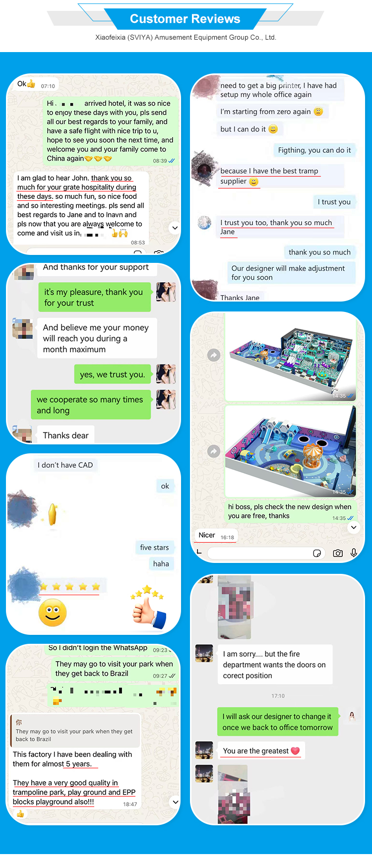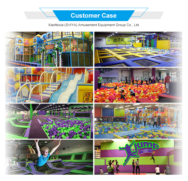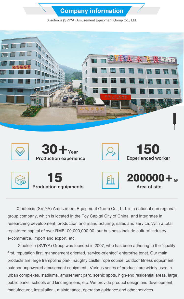 Xiaofeixia (SVIYA) Amusement Equipment Group Co., Ltd is a professional manufacturer of trampoline park, indoor adventure park, family entertainment center, indoor climbing park,kid playground, indoor theme park, etc. We not only provide the complete park construction, but also one-stop solution for all kinds indoor amusment park. As a leading supplier for the indoor amusement park ,we will provide the products and service for you all the time, include design, plan,production, transportation,installation, activites upgrade,cashier system, marketing, advertisement,promotion, etc. You only need to send us your requirements, then we will do all the rest for you.
