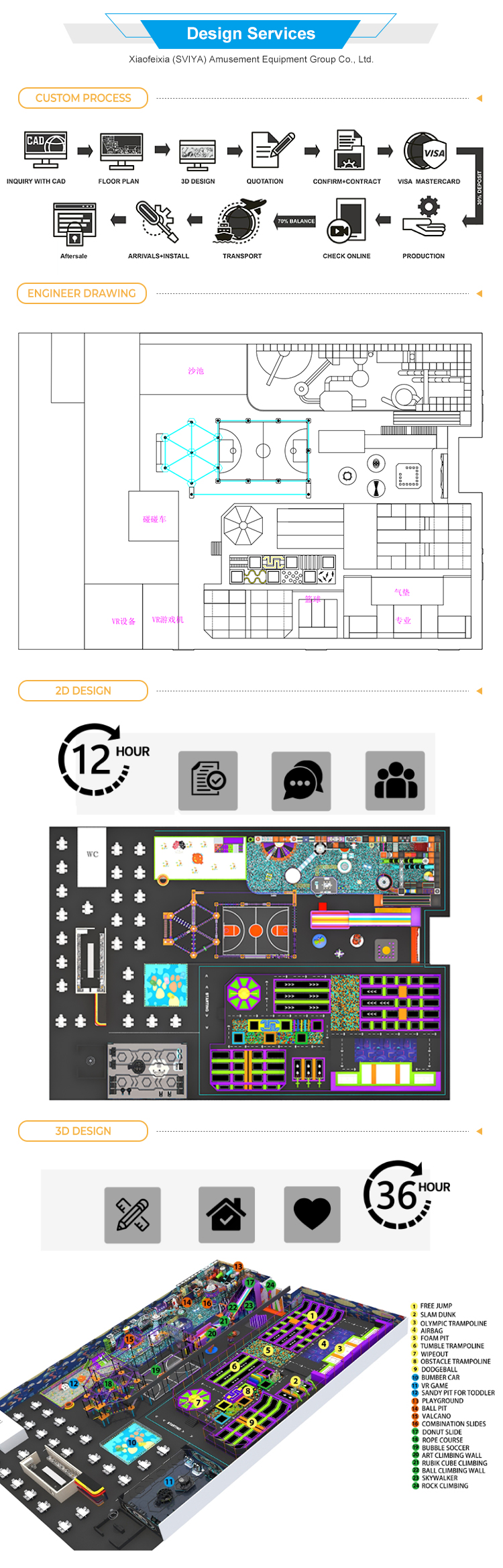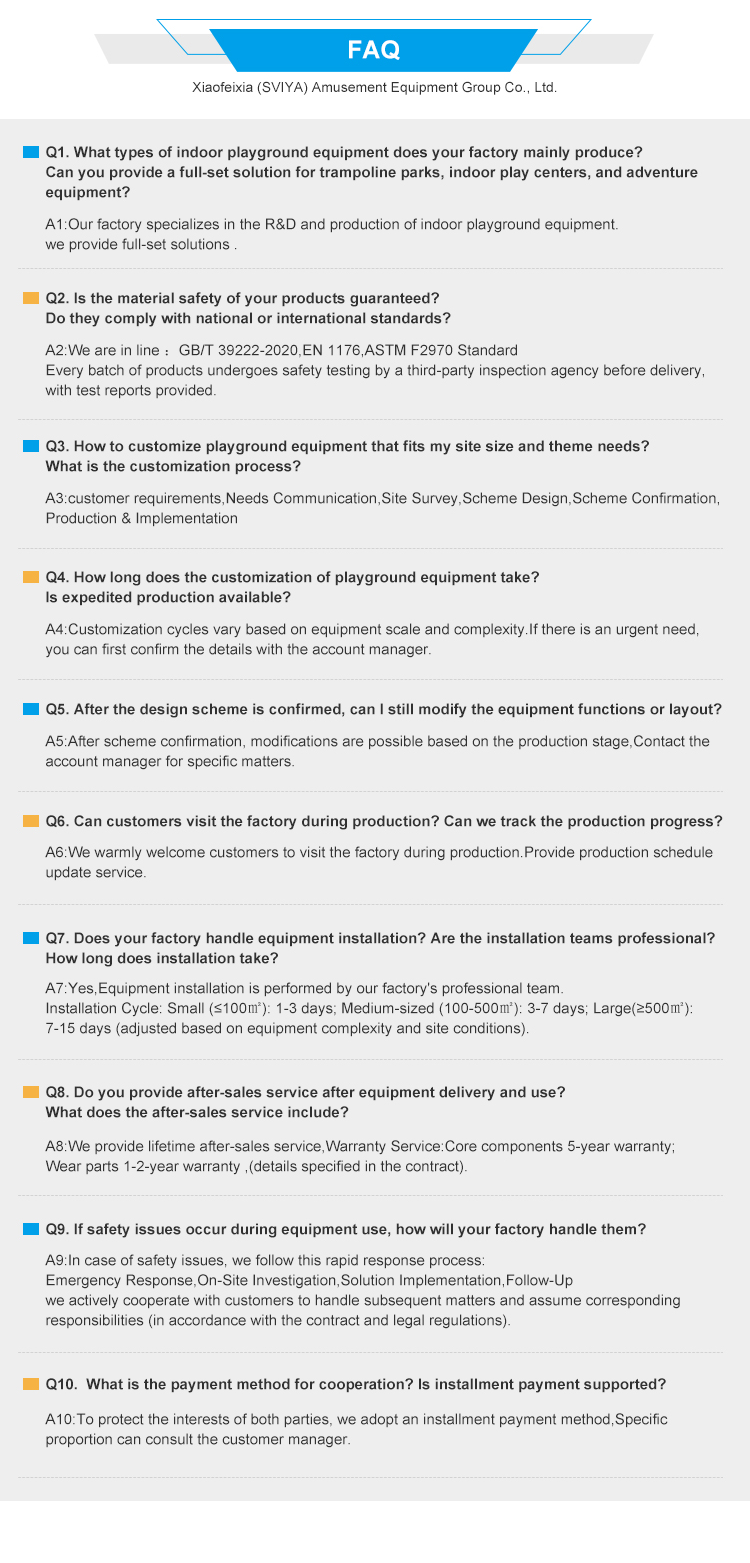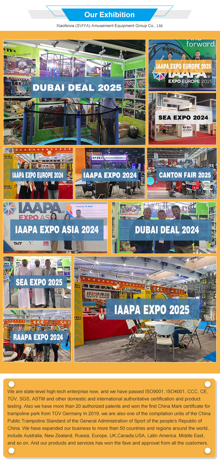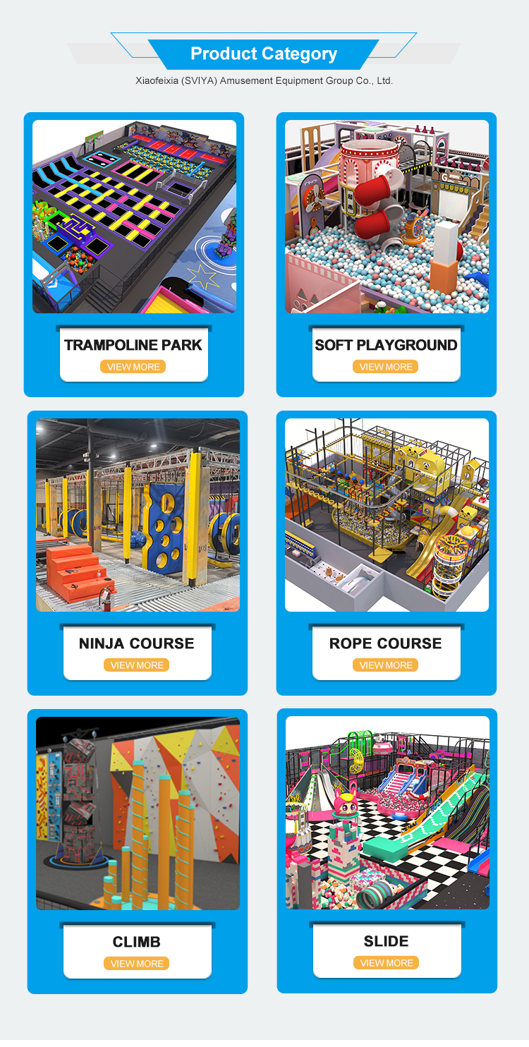 Xiaofeixia (SVIYA) Amusement Equipment Group Co., Ltd is a professional manufacturer of trampoline park, indoor adventure park, family entertainment center, indoor climbing park,kid playground, indoor theme park, etc. We not only provide the complete park construction, but also one-stop solution for all kinds indoor amusment park. As a leading supplier for the indoor amusement park ,we will provide the products and service for you all the time, include design, plan,production, transportation,installation, activites upgrade,cashier system, marketing, advertisement,promotion, etc. You only need to send us your requirements, then we will do all the rest for you.